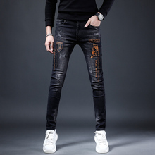 2024秋冬刺绣牛仔裤男潮牌修身小脚裤子弹力休闲黑色男士长裤加绒(158元)