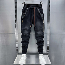 2024秋冬季宽松小直筒哈伦牛仔裤男潮牌工装系绳松紧腰束脚裤子男(132.56元)