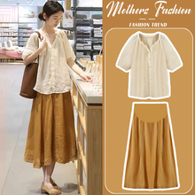 孕妇连衣裙套装夏2024新款宽松薄款短袖娃娃衫上衣半身裙两件套女(69元)