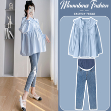 孕妇套装时尚洋气时髦蓝色宽松上衣衬衣牛仔裤两件套2024新款春秋(79元)