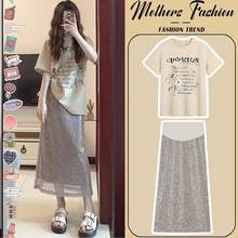 孕妇套装2024新款夏季圆领短袖薄款上衣时尚宽松洋气半身裙两件套(128元)