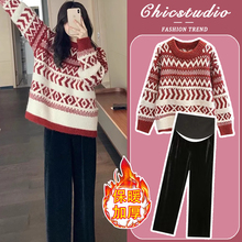 孕妇套装秋冬2024新款宽松复古加厚过年红色针织毛衣圆领上衣裤子(79元)
