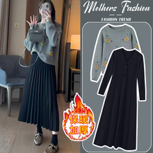 孕妇连衣裙套装2024秋冬新款甜美刺绣花朵休闲毛衣针织长裙两件套(79元)