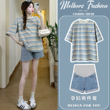 孕妇套装夏2024新款蓝色条纹宽松时尚薄款短袖上衣牛仔短裤两件套(128元)
