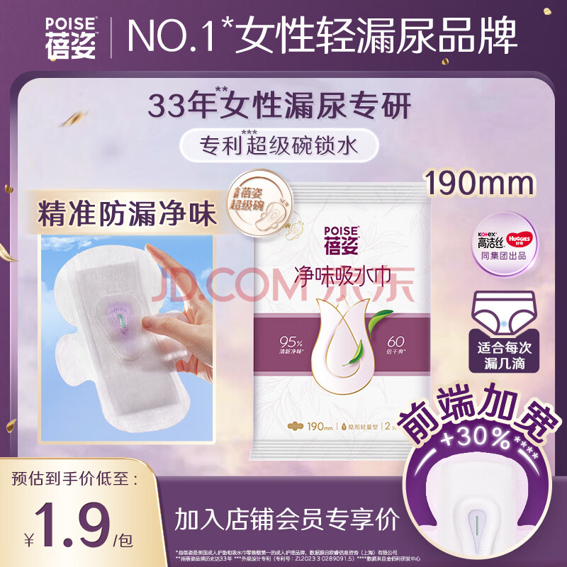 蓓姿(POISE)女性漏尿专用卫生巾产后吸水巾垫超级碗190mm2片(1.9元)
