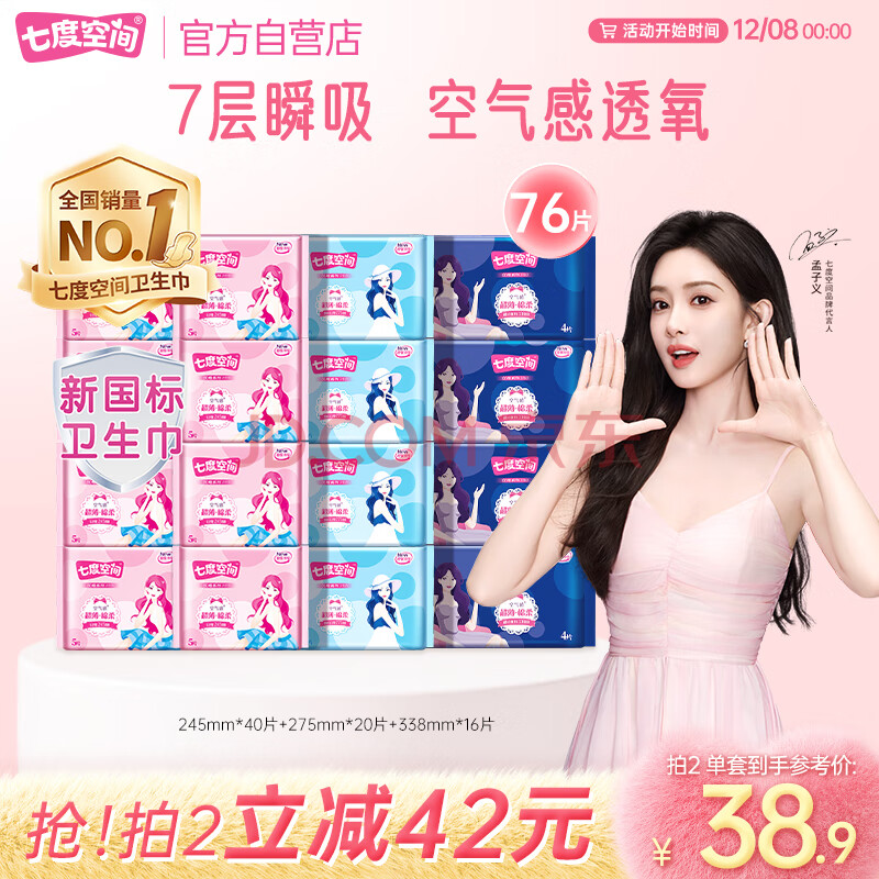 七度空间优雅卫生巾超薄透气日夜组合棉柔空气感姨妈巾76片【新国标(59.9元)