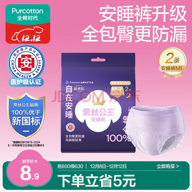 全棉时代奈丝公主医护级纯棉安心裤安睡裤裤型卫生巾ML 2条旅行装京(6.9元)