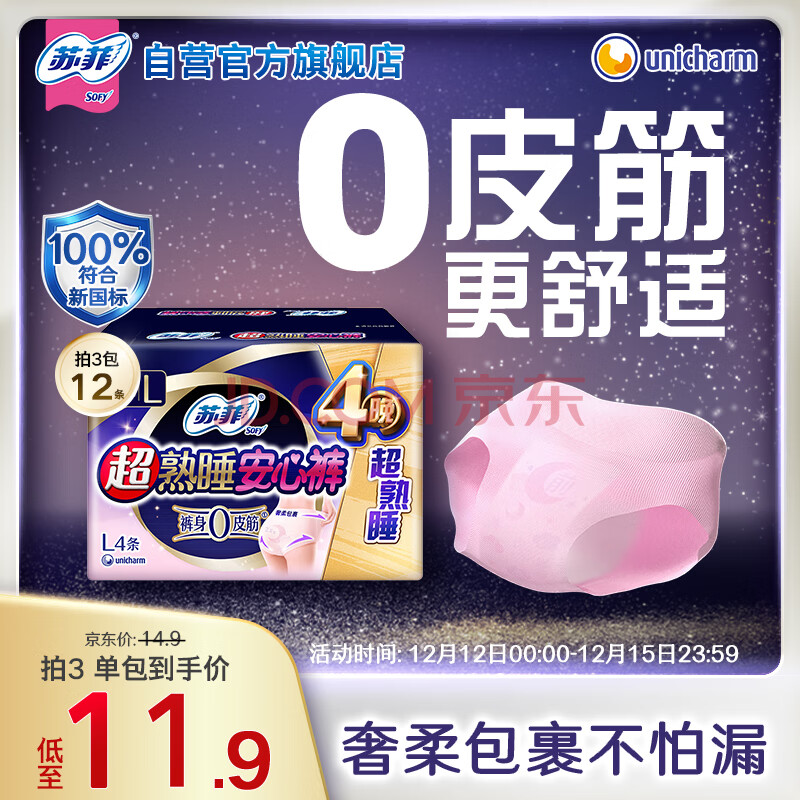 苏菲超薄透气0皮筋超熟睡安心裤L码4条 量大安睡裤卫生巾夜安裤自营(14.88元)