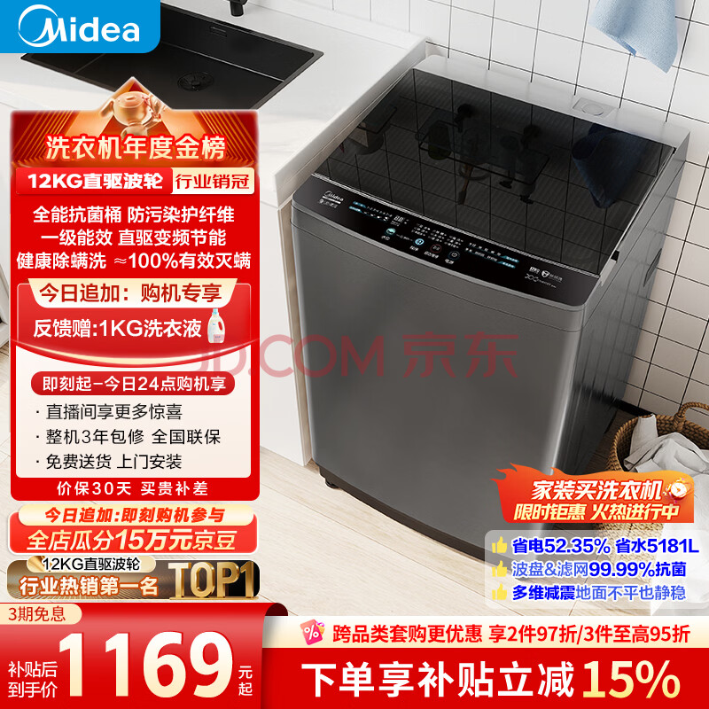 美的(Midea)随心洗 波轮洗衣机全自动 12公斤大容量 直驱变频 专(1145.97元)