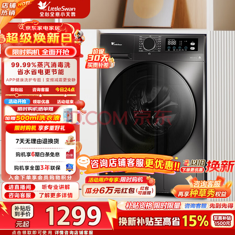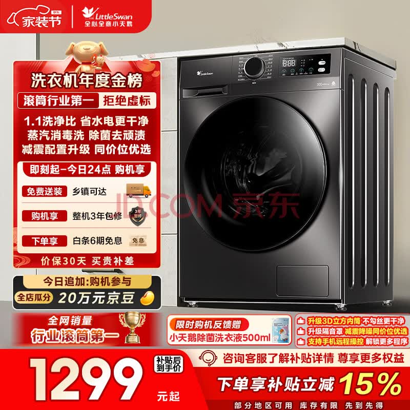 小天鹅(LittleSwan)10KG滚筒洗衣机全自动懒人超薄蒸汽消毒洗智能(1184.05元)