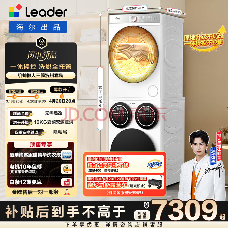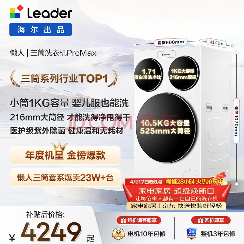 统帅(Leader)独家首发 海尔出品懒人三筒洗衣机ProMax 12.5KG滚筒(4249.06元)
