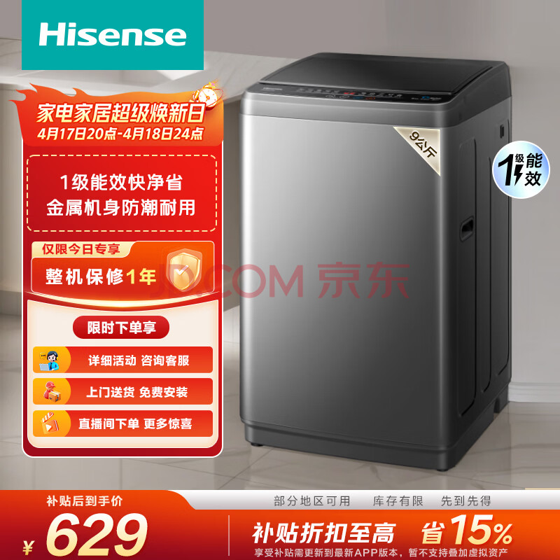 海信(Hisense)全自动波轮洗衣机9KG小型 家用租房宿舍 金属机身一(629元)