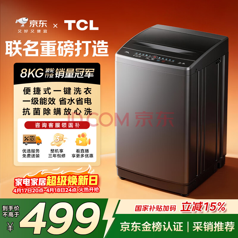 TCL京东联名款波轮洗衣机全自动8KG一级能效小型家用家电国家补贴以(509.15元)