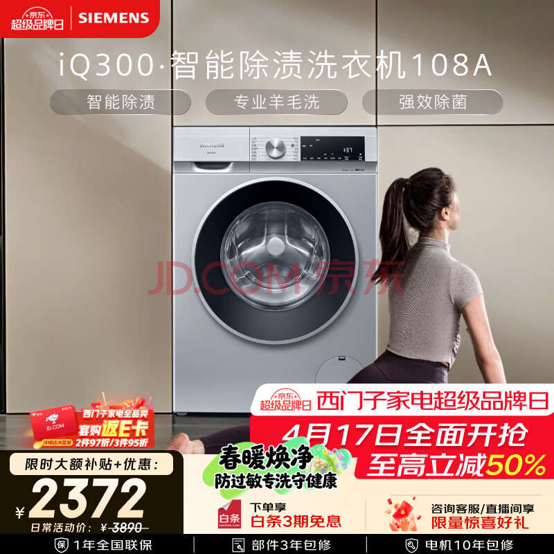 西门子(SIEMENS)iQ300 10KG大容量全自动变频滚筒洗衣机 智能除渍(2789.1元)