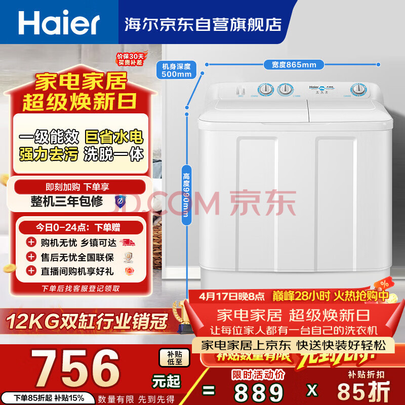 海尔(Haier)半自动双桶双缸洗衣机 12KG大容量 强力去污洗大件 (703.8元)