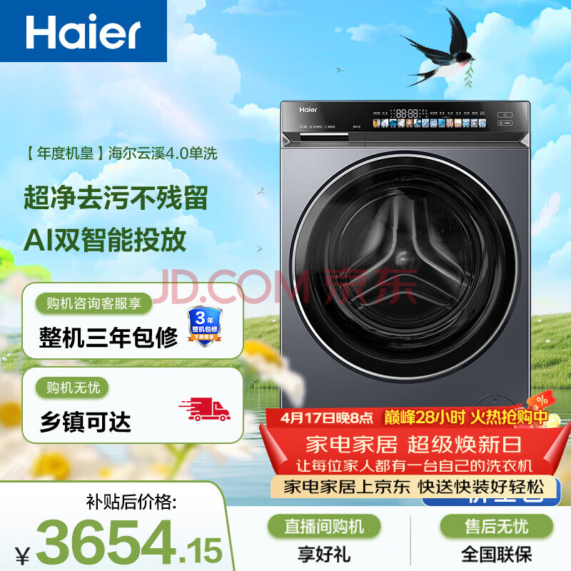 海尔(Haier)云溪4.0高配版 滚筒洗衣机单洗全自动家用 10公斤超薄(3653.64元)