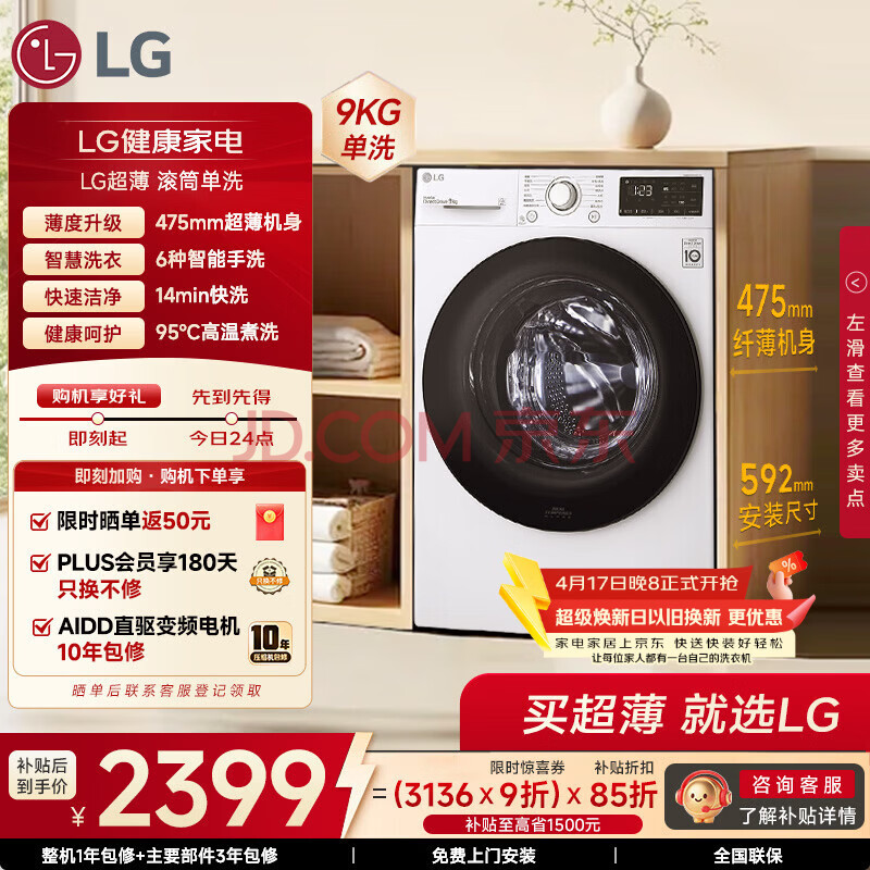 海尔(Haier)小红花 全自动滚筒洗衣机10KG 超薄直驱 冲浪洗 减震(2599.47元)