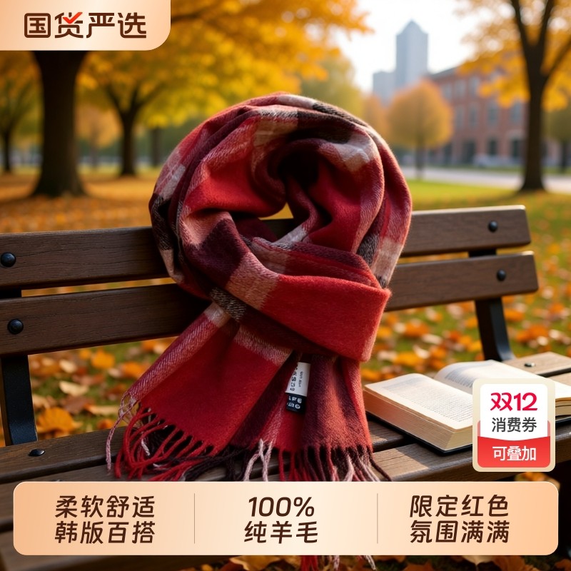 100%澳洲纯羊毛红色格子围巾2025新款男女学生冬季生日礼物秋冬款(62.1元)