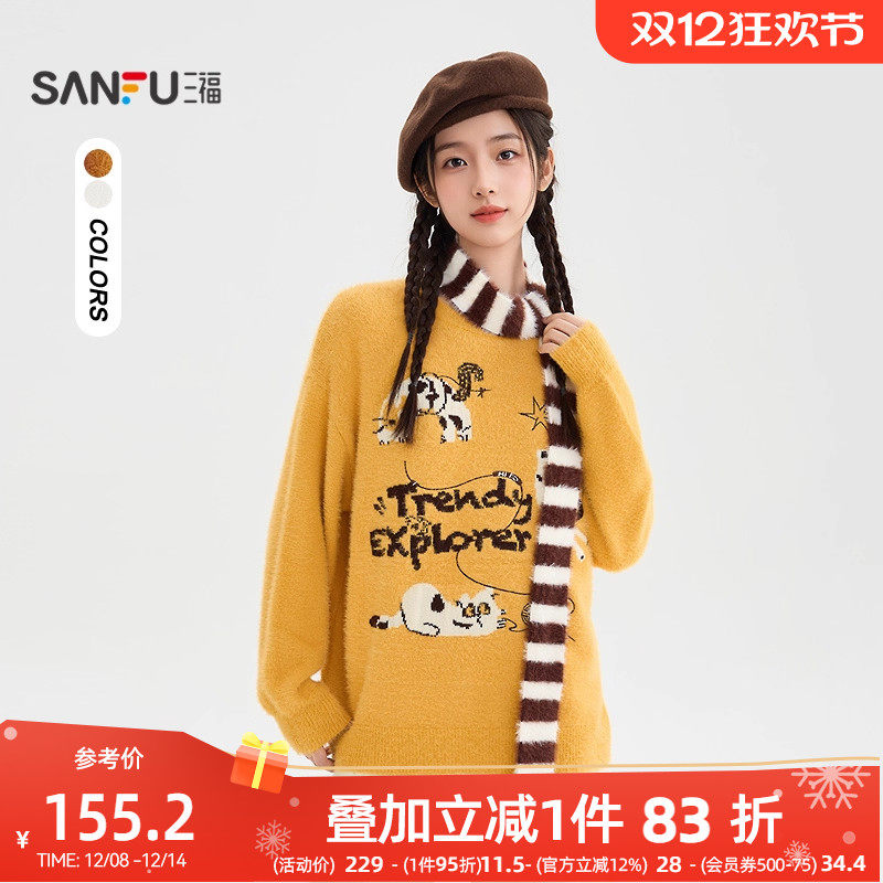 三福套头毛衣秋冬女2025新款条纹围巾猫咪绣花宽松上衣女装511628(179元)