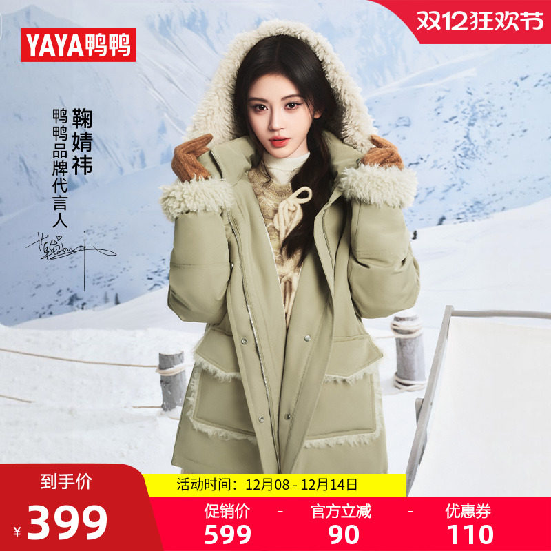 【鞠婧祎同款】鸭鸭羽绒服女2025年秋冬新品时尚拼接连帽保暖外套(399元)