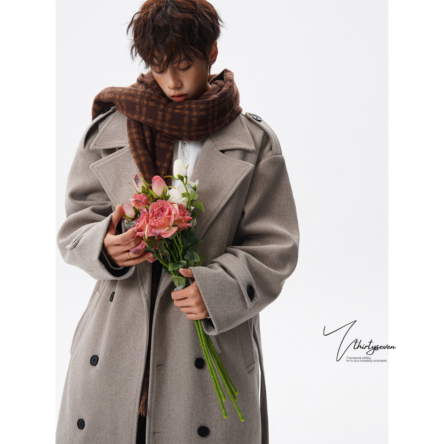 V37韩系双排扣中长款过膝毛呢大衣男冬季氛围感防寒保暖加棉外套(165元)