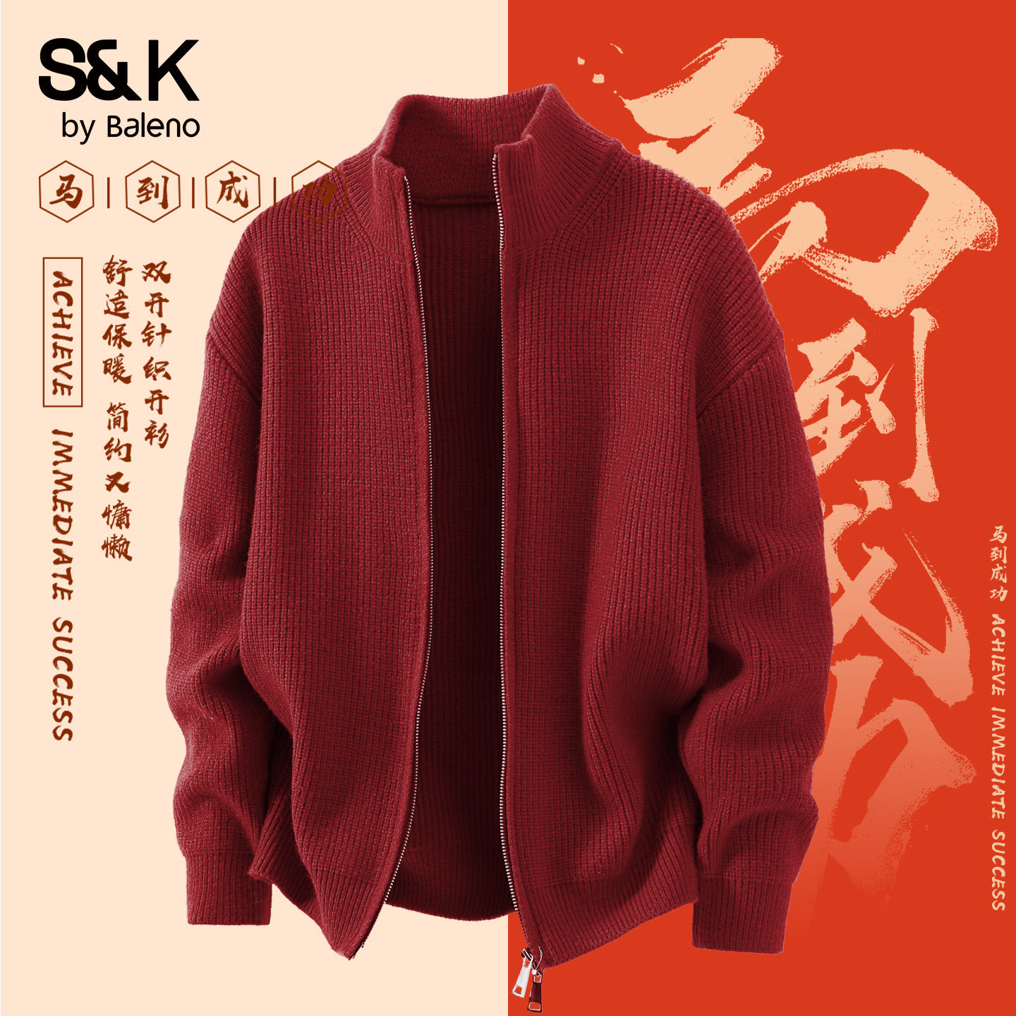 班尼路S&K红色开衫毛衣男冬季保暖男士针织衫本命年男生毛衫上衣A(59.9元)