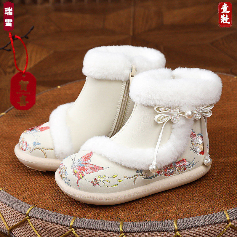 汉服鞋女童冬季新款中式雪地靴子古风手工加绒棉鞋拜年儿童绣花鞋(52.7元)
