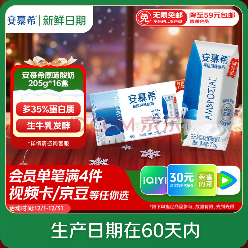 伊利【新鲜日期】安慕希希腊风味早餐酸奶原味205g*16盒 礼盒装(41.9元)