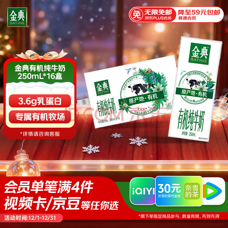 伊利金典有机纯牛奶整箱 250ml*16盒 3.6g乳蛋白 礼盒裝(49.9元)