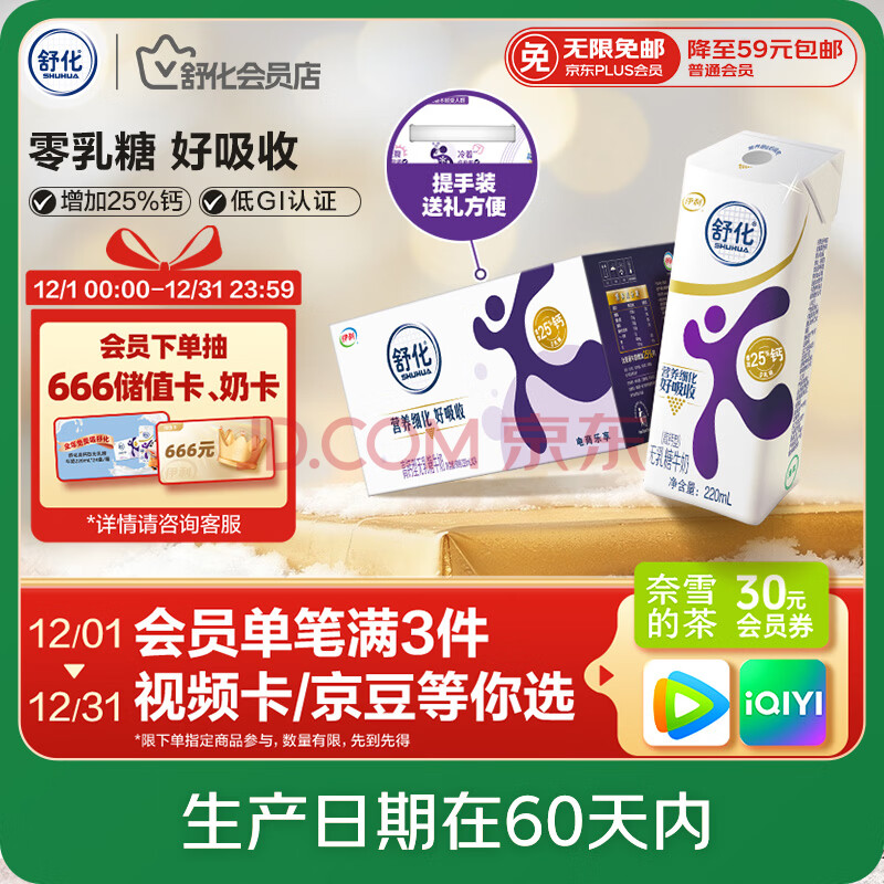 舒化奶0乳糖 【新鲜日期】高钙牛奶220ml*24盒 礼盒装 (63.9元)