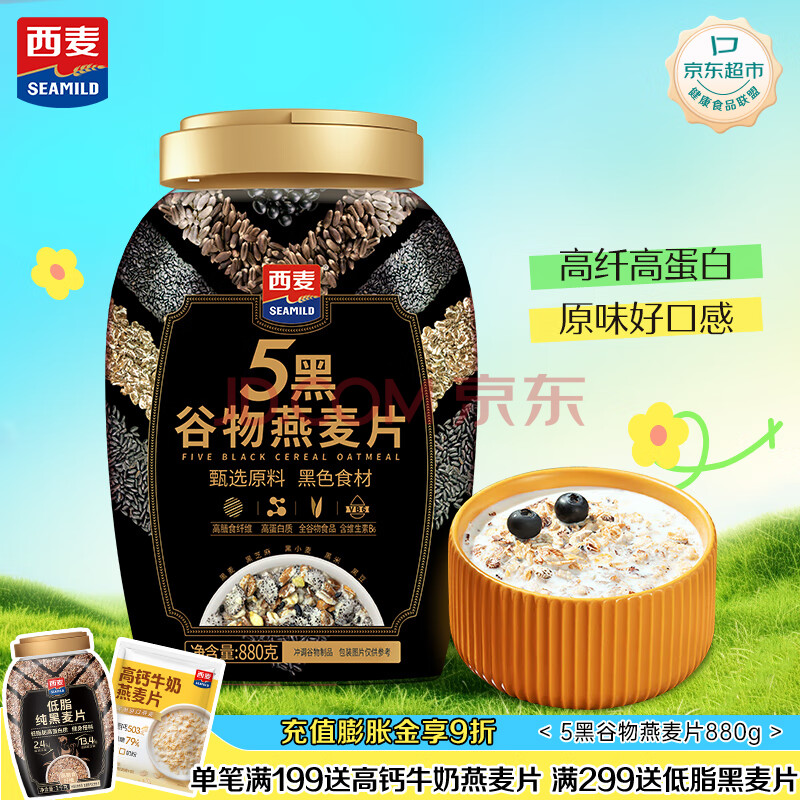 西麦5黑谷物燕麦片880g桶装 谷物代餐即食营养早餐无添加蔗糖(33.9元)