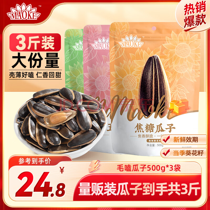 MAOKE量贩装毛嗑瓜子葵花籽坚果炒货口味随机 500g*3袋(28.8元)