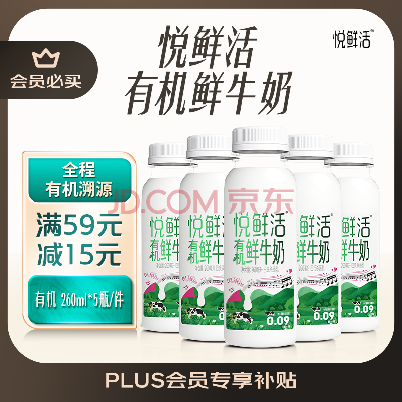 悦鲜活有机鲜牛奶 260ml*5瓶 巴氏杀菌乳 生鲜 低温奶(32.9元)