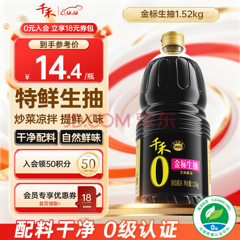 千禾0添加酱油 金标生抽酿造酱油1.52kg零添加厨房家用炒菜凉拌调味(49.8元)