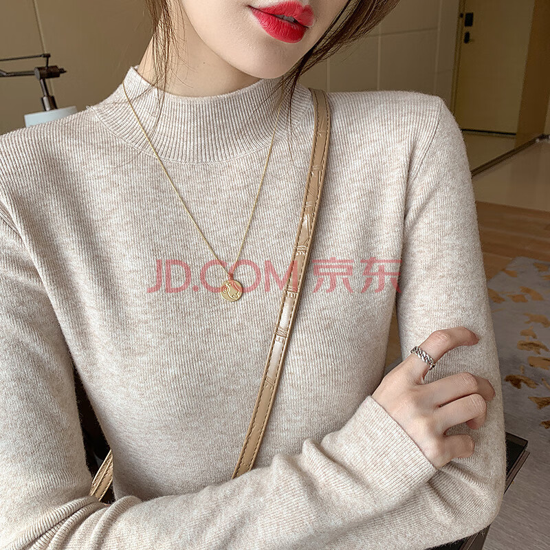 俞兆林针织打底衫女内搭半高领毛衣修身长袖中领可外穿上衣秋冬杏色(49.9元)