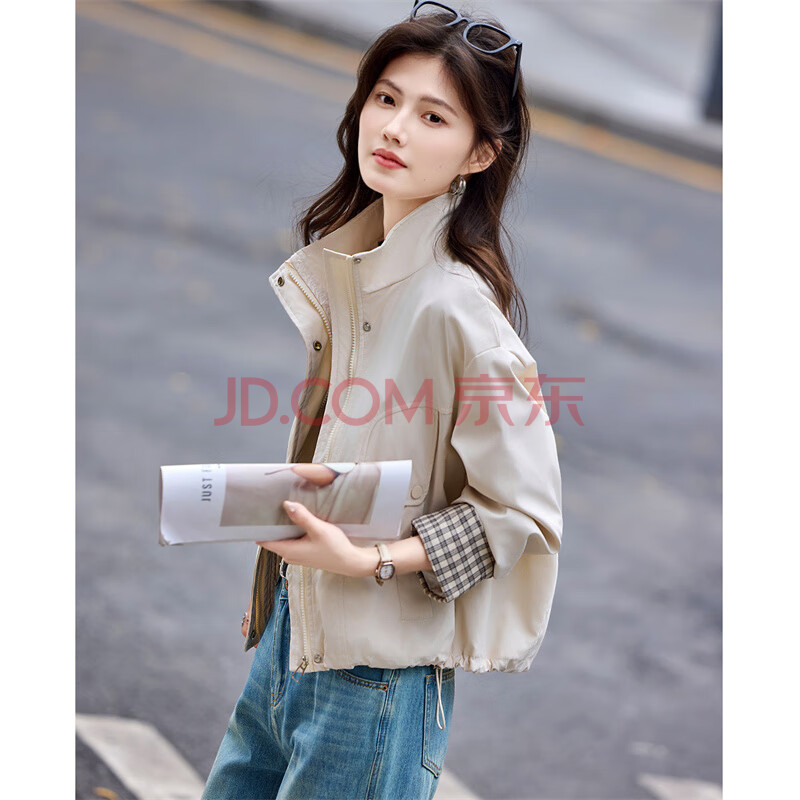 尚静外套女秋秋新款女装时尚百搭格纹撞色抽绳设计感小个子短款外套(278.6元)