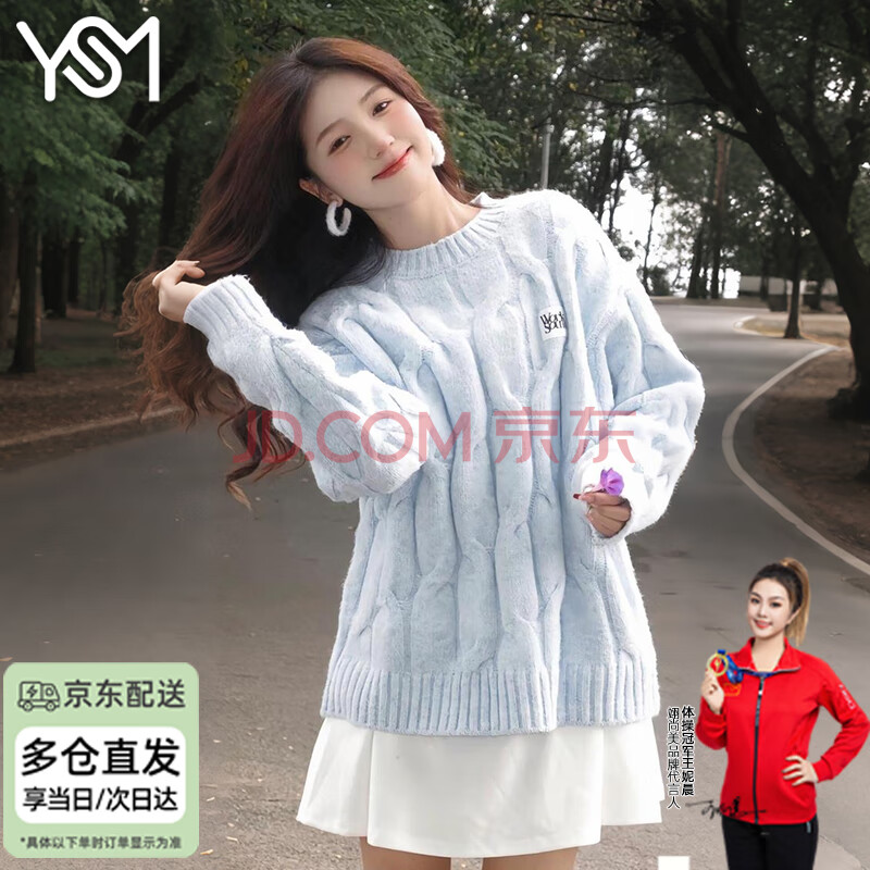 翊尚美蓝色毛衣女秋冬季2025新款慵懒风针织衫休闲外穿加厚宽松圆领(89.9元)