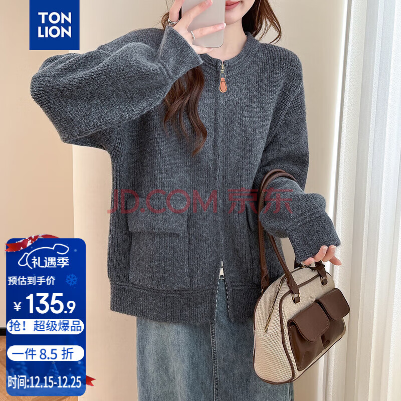 唐狮(TonLion)2025秋冬休闲简约风拉链女开衫毛衣(159.9元)