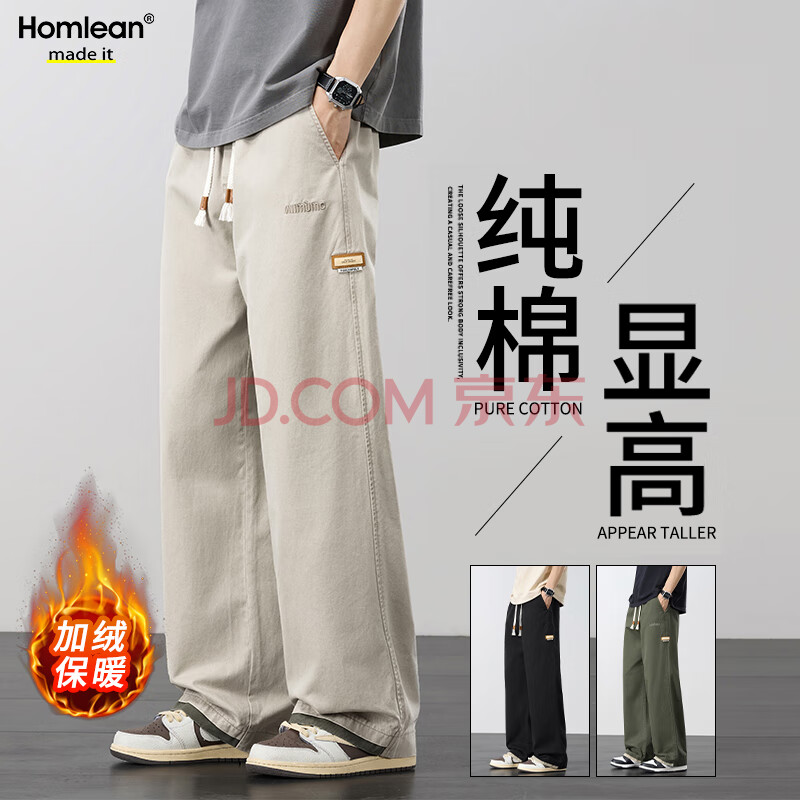 Homlean休闲裤男纯棉直筒加绒保暖冬季宽松阔腿裤子男潮流HZ27JR卡(138.9元)