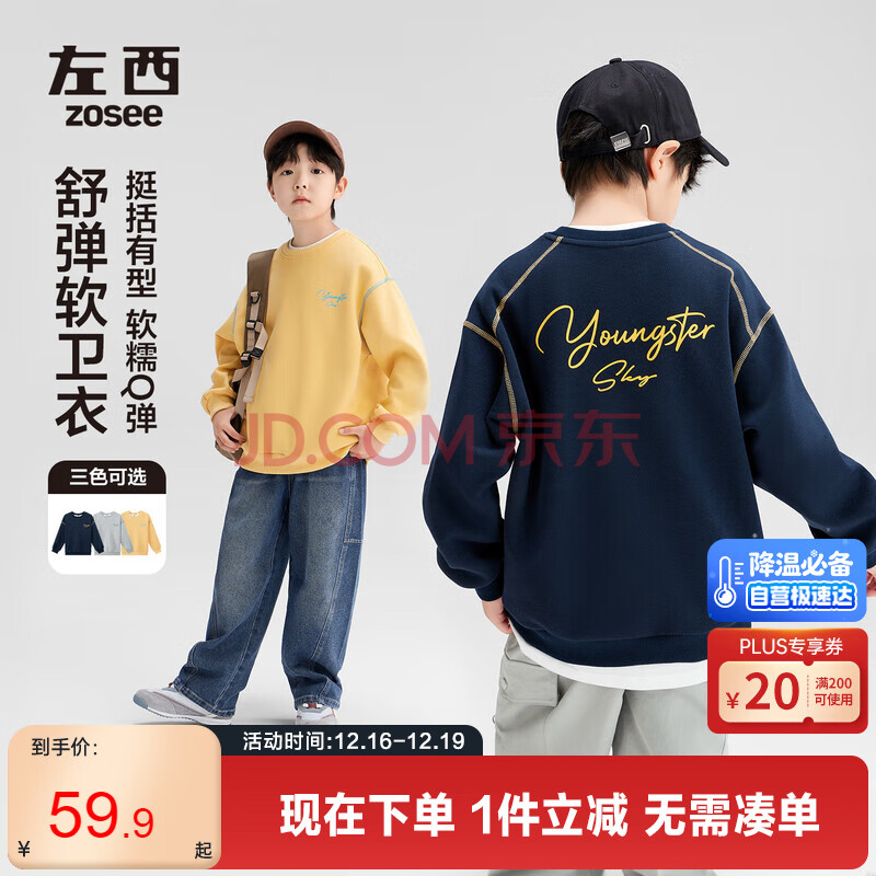 左西童装男童卫衣2025新款儿童加绒撞色字母印花加绒上衣 藏青色 1(82.9元)
