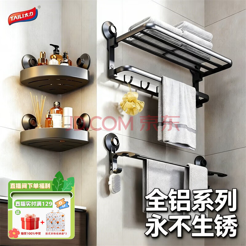太力吸盘卫生间置物架免打孔浴室挂式上墙置物架毛巾浴巾纸巾盒墙角(159.5元)