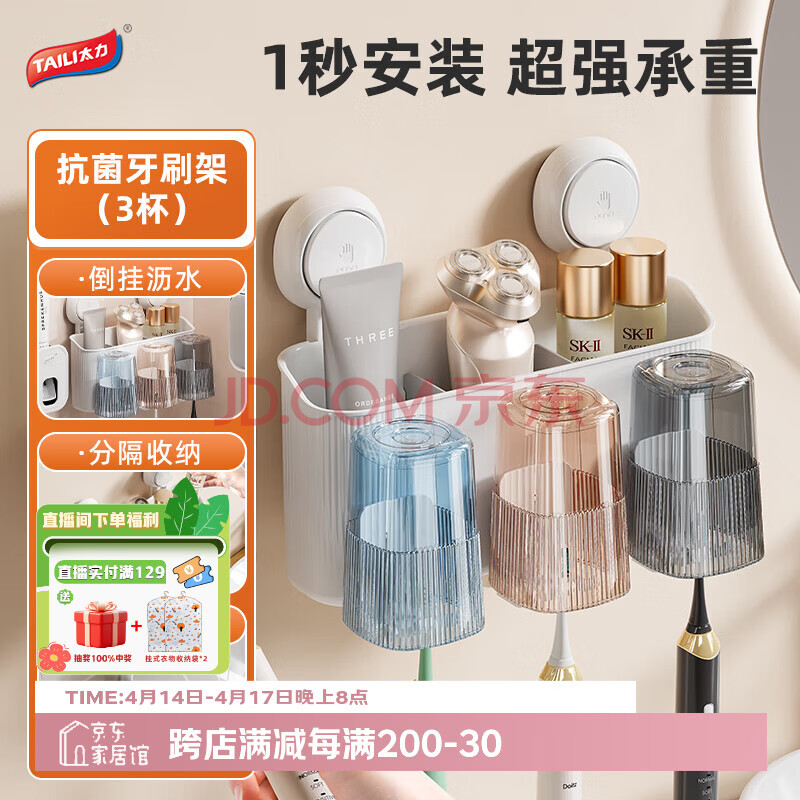 太力牙刷置物架卫生间壁挂漱口杯置物架浴室高级免打孔牙刷架套餐三(34.11元)
