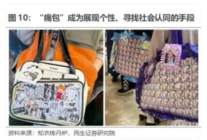 二是“痛文化”兴起,来展示自己的“谷圈属性”。痛包(itabag)起源于日本ACG(ACG是动画、漫画、电子游戏的英文Anime、Comics、Games的首字母缩写),是指挂满二次元周边装饰的包包,因为这样的包看上去十分夸张,且视觉冲击感强烈,让人看了就觉得“痛”。常见的痛包最外侧会有一个由聚氯乙烯(pvc)材料制作的透明夹层,人们通常会将收集来的吧唧,也就是二次元人物的周边徽章整齐排布在夹层里,用来装饰自己的痛包。当然,除了吧唧,人们还会用各种方式装饰包包,比如棉花娃娃、手办、玩偶等,以表达自己的个性爱好。这种特殊且极具个性的表达形式,让痛包迅速形成了一种文化并且在社媒平台上广泛传播。